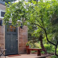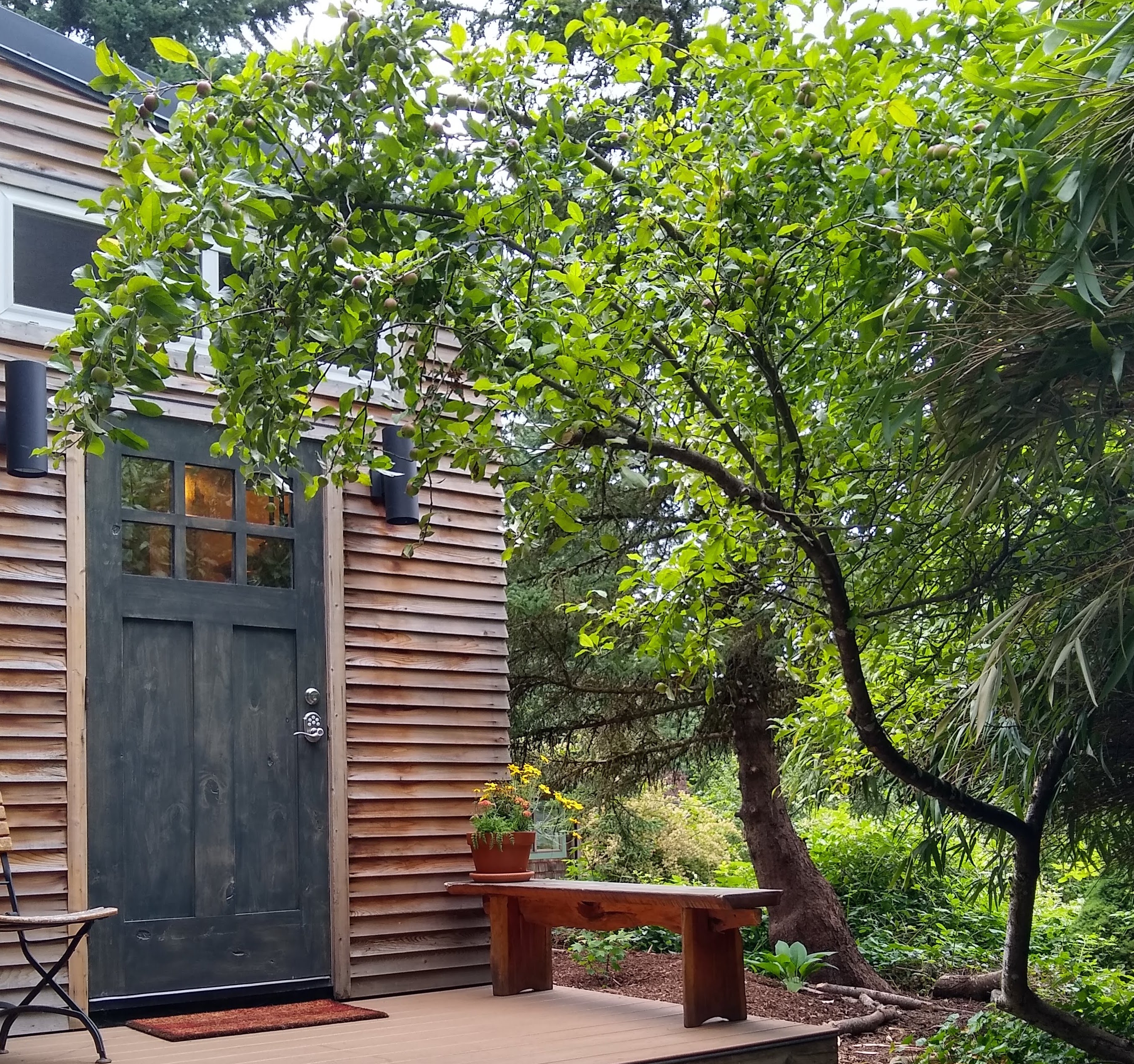 Tucked into a serene hillside garden, with stately trees and winding paths, Moss Rock beckons you outside to write. The private porch of the tiny house, which faces the sunrise, is perfect for welcoming the day, while the two decks in the garden offer fresh inspiration and a spectacular view of the evening light show.