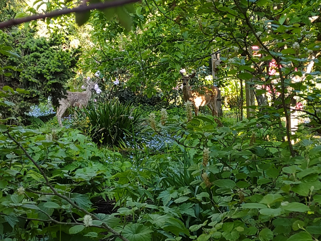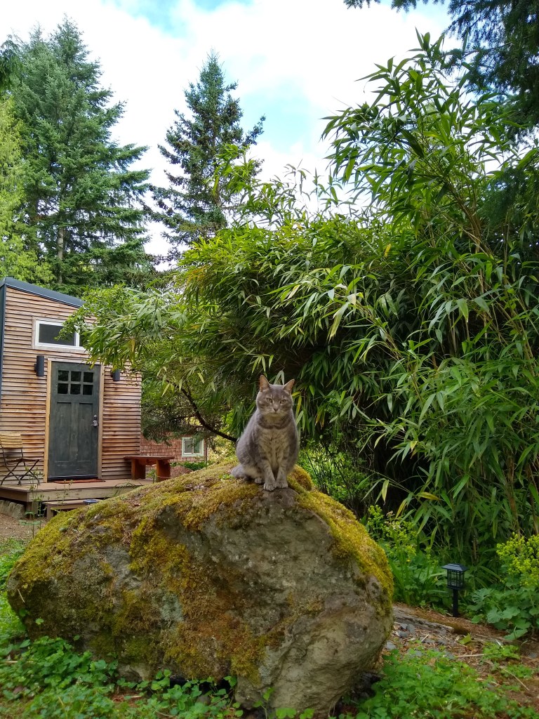 Moss Rock Retreat is home to a friendly flock of chickens and our “supervisor” cat. Many wild animals regularly visit the garden, including song birds, humming birds, rabbits, deer, raccoon, frogs, coyote, owls, hawks, an occasional bald eagle, and a family of crows. Blue heron, geese, and ducks migrate through in the spring and fall. The garden, with its many Pacific Northwest native plantings, also hosts beautiful pollinators.